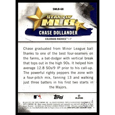 This is a 2025 Topps Update Stars of MLB Chase Dollander baseball card. The card is #SMLB-68 and pictures show condition. Team(s): Colorado Rockies Rookie Card (RC)