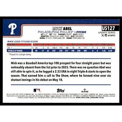 This is a 2025 Topps Update Mick Abel baseball card. The card is #US127 and pictures show condition. Team(s): Philadelphia Phillies Rookie Card (RC)