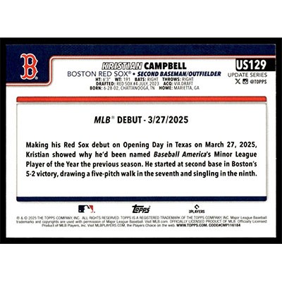 This is a 2025 Topps Update Kristian Campbell Rookie Debut baseball card. The card is #US129 and pictures show condition. Team(s): Boston Red Sox Rookie Card (RC)
