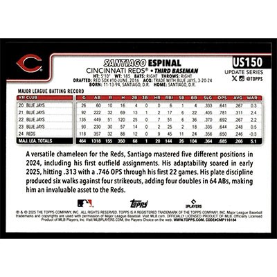 This is a 2025 Topps Update Santiago Espinal baseball card. The card is #US150 and pictures show condition.