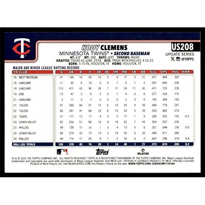 This is a 2025 Topps Update Kody Clemens baseball card. The card is #US208 and pictures show condition.
