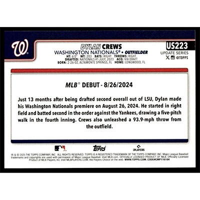 This is a 2025 Topps Update Dylan Crews Rookie Debut baseball card. The card is #US223 and pictures show condition. Team(s): Washington Nationals Rookie Card (RC)