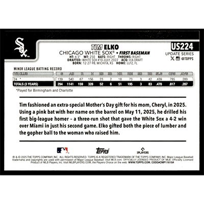 This is a 2025 Topps Update Tim Elko baseball card. The card is #US224 and pictures show condition.