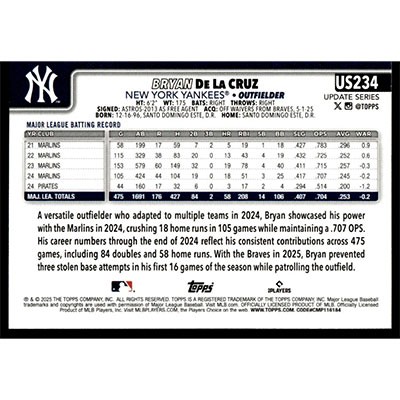 This is a 2025 Topps Update Bryan De La Cruz baseball card. The card is #US234 and pictures show condition.