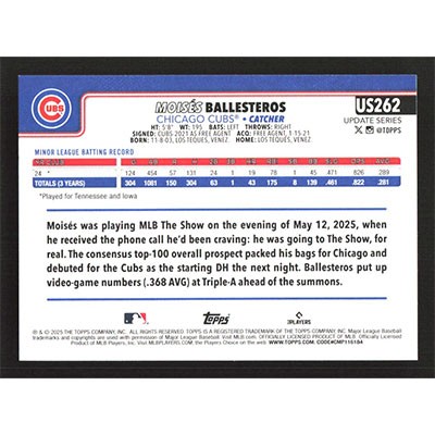 This is a 2025 Topps Update Moises Ballesteros baseball card. The card is #US262 and pictures show condition.