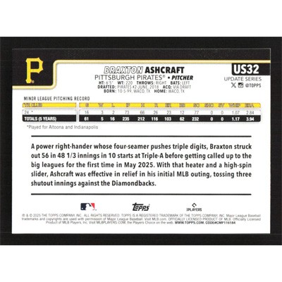 This is a 2025 Topps Update Braxton Ashcraft baseball card. The card is #US32 and pictures show condition. Team(s): Pittsburgh Pirates Rookie Card (RC)