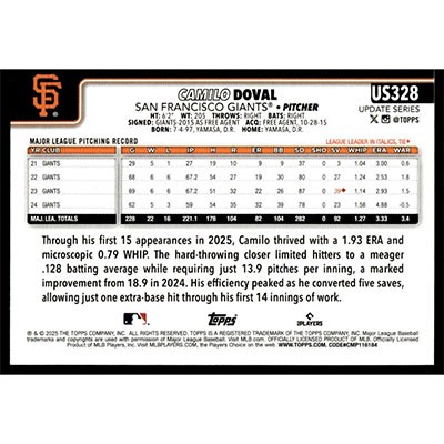 This is a 2025 Topps Update Camilo Doval baseball card. The card is #US328 and pictures show condition.