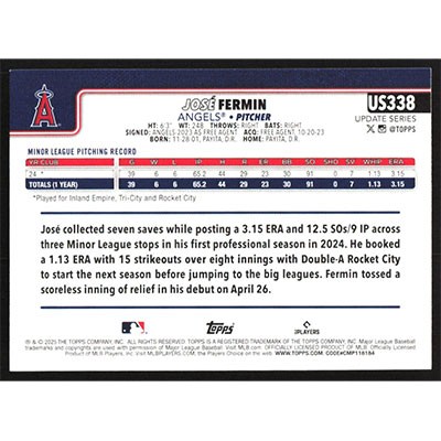 This is a 2025 Topps Update Jose Fermin baseball card. The card is #US338 and pictures show condition. Team(s): Los Angeles Angels Rookie Card (RC)