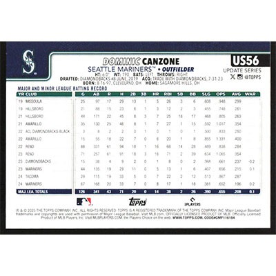 This is a 2025 Topps Update Dominic Canzone baseball card. The card is #US56 and pictures show condition.