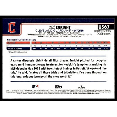 This is a 2025 Topps Update Nic Enright baseball card. The card is #US67 and pictures show condition. Team(s): Cleveland Guardians Rookie Card (RC)