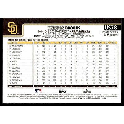 This is a 2025 Topps Update Trenton Brooks baseball card. The card is #US78 and pictures show condition.