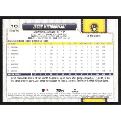 This is a 2026 Topps Jacob Misiorowski baseball card. The card is #10 and pictures show condition.