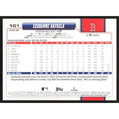 This is a 2026 Topps Ceddanne Rafaela baseball card. The card is #101 and pictures show condition.