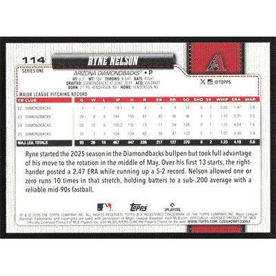 This is a 2026 Topps Ryne Nelson baseball card. The card is #114 and pictures show condition.