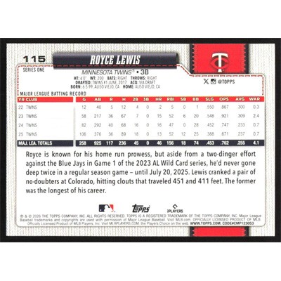 This is a 2026 Topps Royce Lewis baseball card. The card is #115 and pictures show condition.
