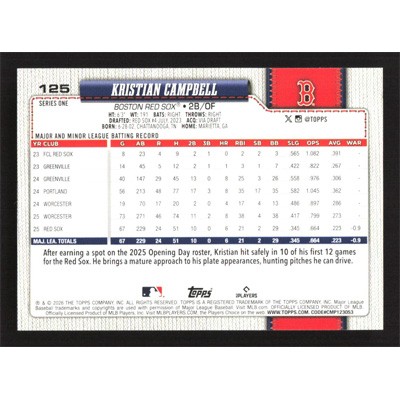 This is a 2026 Topps Kristian Campbell Future Stars baseball card. The card is #125 and pictures show condition.