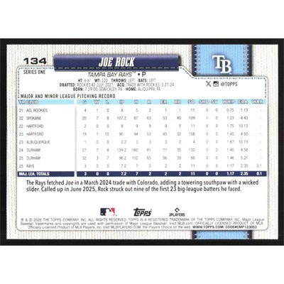 This is a 2026 Topps Joe Rock baseball card. The card is #134 and pictures show condition.