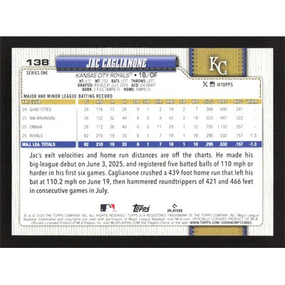 This is a 2026 Topps Jac Caglianone baseball card. The card is #138 and pictures show condition.