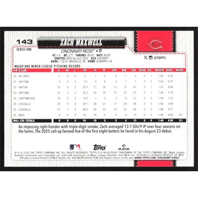 This is a 2026 Topps Zach Maxwell baseball card. The card is #143 and pictures show condition.