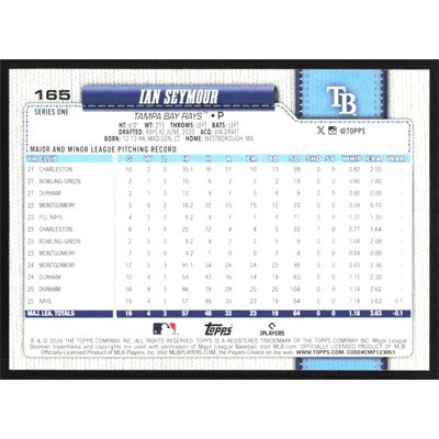 This is a 2026 Topps Ian Seymour baseball card. The card is #165 and pictures show condition.