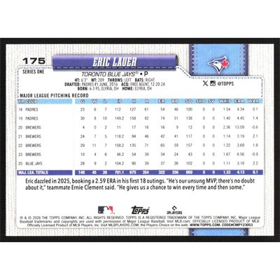 This is a 2026 Topps Eric Lauer baseball card. The card is #175 and pictures show condition.
