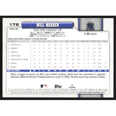 This is a 2026 Topps Will Warren baseball card. The card is #176 and pictures show condition.