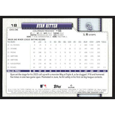 This is a 2026 Topps Ryan Ritter baseball card. The card is #18 and pictures show condition.