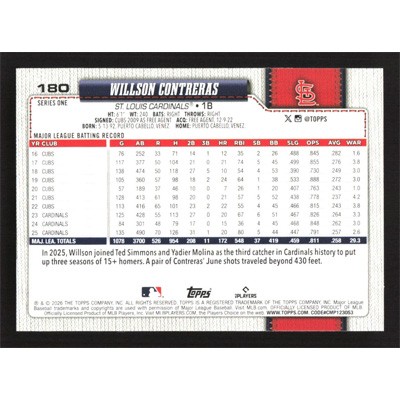This is a 2026 Topps Willson Contreras baseball card. The card is #180 and pictures show condition.