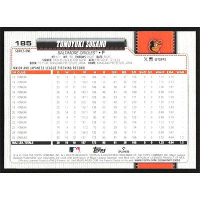This is a 2026 Topps Tomoyuki Sugano baseball card. The card is #185 and pictures show condition.