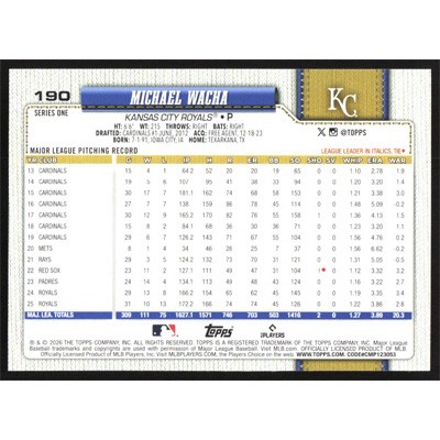 This is a 2026 Topps Michael Wacha baseball card. The card is #190 and pictures show condition.