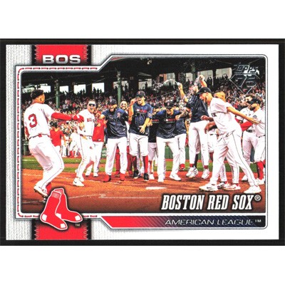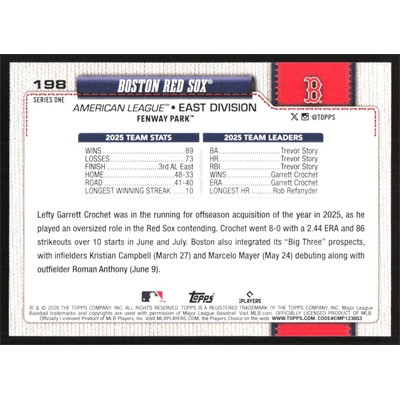 This is a 2026 Topps Boston Red Sox Team Card baseball card. The card is #198 and pictures show condition.