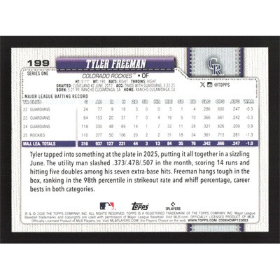 This is a 2026 Topps Tyler Freeman baseball card. The card is #199 and pictures show condition.