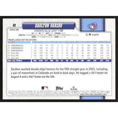 This is a 2026 Topps Daulton Varsho baseball card. The card is #2 and pictures show condition.