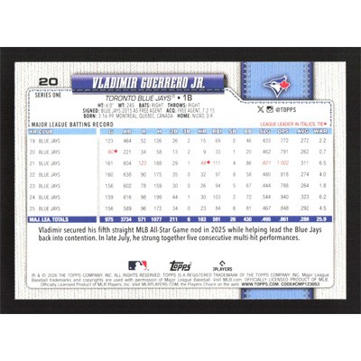 This is a 2026 Topps Vladimir Guerrero Jr. baseball card. The card is #20 and pictures show condition.