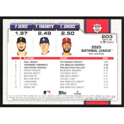 This is a 2026 Topps Paul Skenes, Yoshinobu Yamamoto and Christopher Sanchez League Leaders baseball card. The card is #203 and pictures show condition.