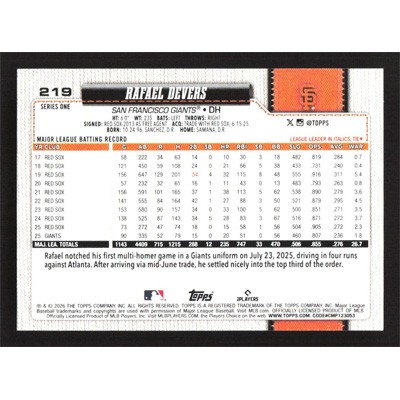 This is a 2026 Topps Rafael Devers baseball card. The card is #219 and pictures show condition.