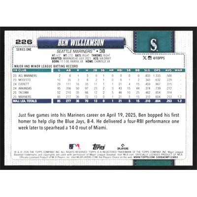 This is a 2026 Topps Ben Williamson baseball card. The card is #226 and pictures show condition.