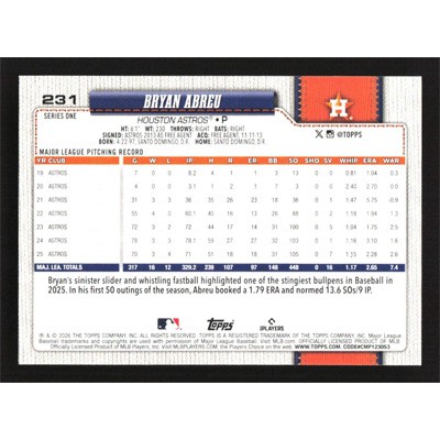 This is a 2026 Topps Bryan Abreu baseball card. The card is #231 and pictures show condition.