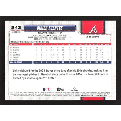 This is a 2026 Topps Didier Fuentes baseball card. The card is #243 and pictures show condition.