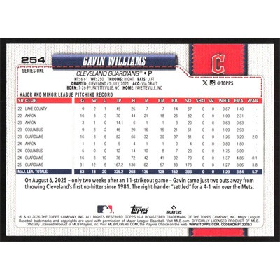 This is a 2026 Topps Gavin Williams baseball card. The card is #254 and pictures show condition.