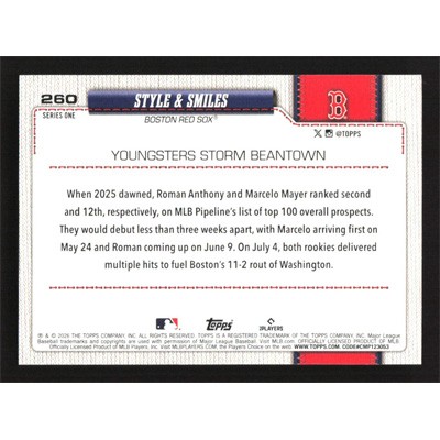 This is a 2026 Topps Roman Anthony and Marcello Mayer Style & Smiles baseball card. The card is #260 and pictures show condition.