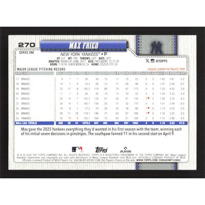 This is a 2026 Topps Max Fried baseball card. The card is #270 and pictures show condition.