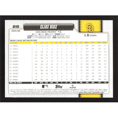 This is a 2026 Topps Elias Diaz baseball card. The card is #28 and pictures show condition.