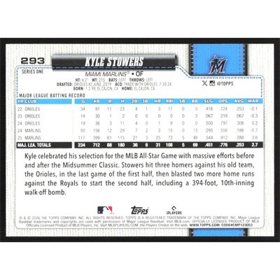 This is a 2026 Topps Kyle Stowers baseball card. The card is #293 and pictures show condition.