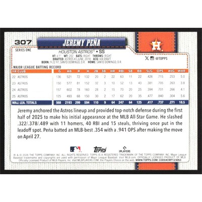 This is a 2026 Topps Jeremy Pena baseball card. The card is #307 and pictures show condition.