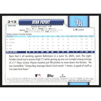 This is a 2026 Topps Ryan Pepiot baseball card. The card is #313 and pictures show condition.