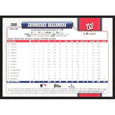 This is a 2026 Topps Shinnosuke Ogasawara baseball card. The card is #32 and pictures show condition.