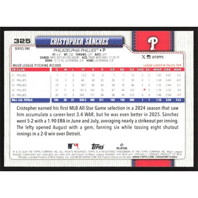 This is a 2026 Topps Cristopher Sanchez baseball card. The card is #325 and pictures show condition.
