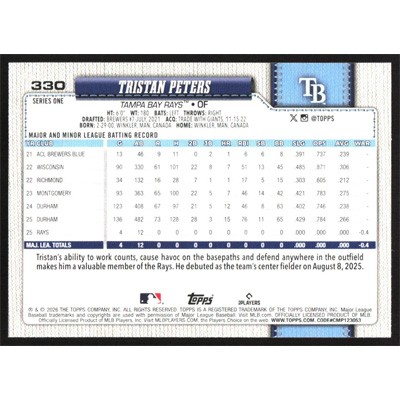 This is a 2026 Topps Tristan Peters baseball card. The card is #330 and pictures show condition.