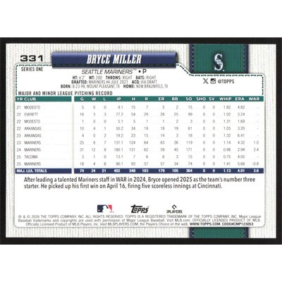 This is a 2026 Topps Bryce Miller baseball card. The card is #331 and pictures show condition.